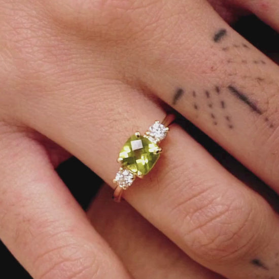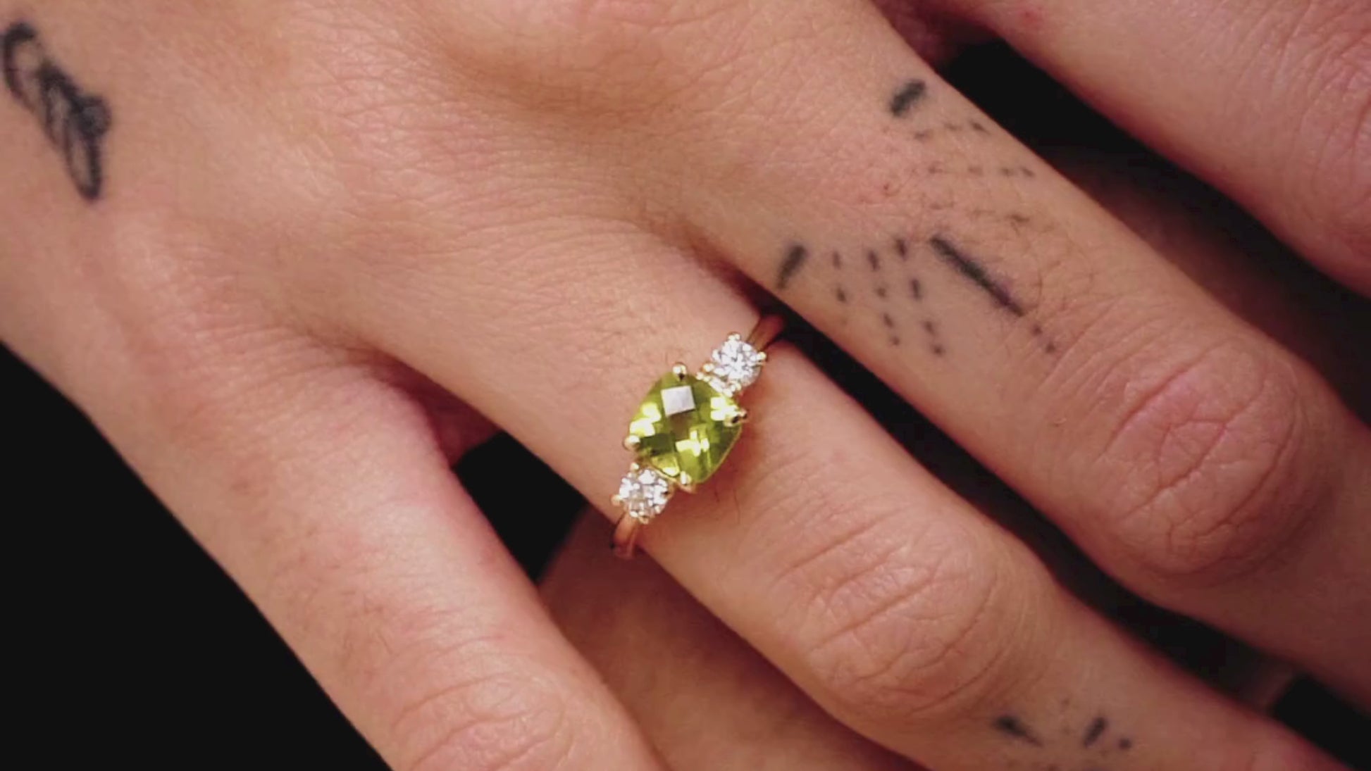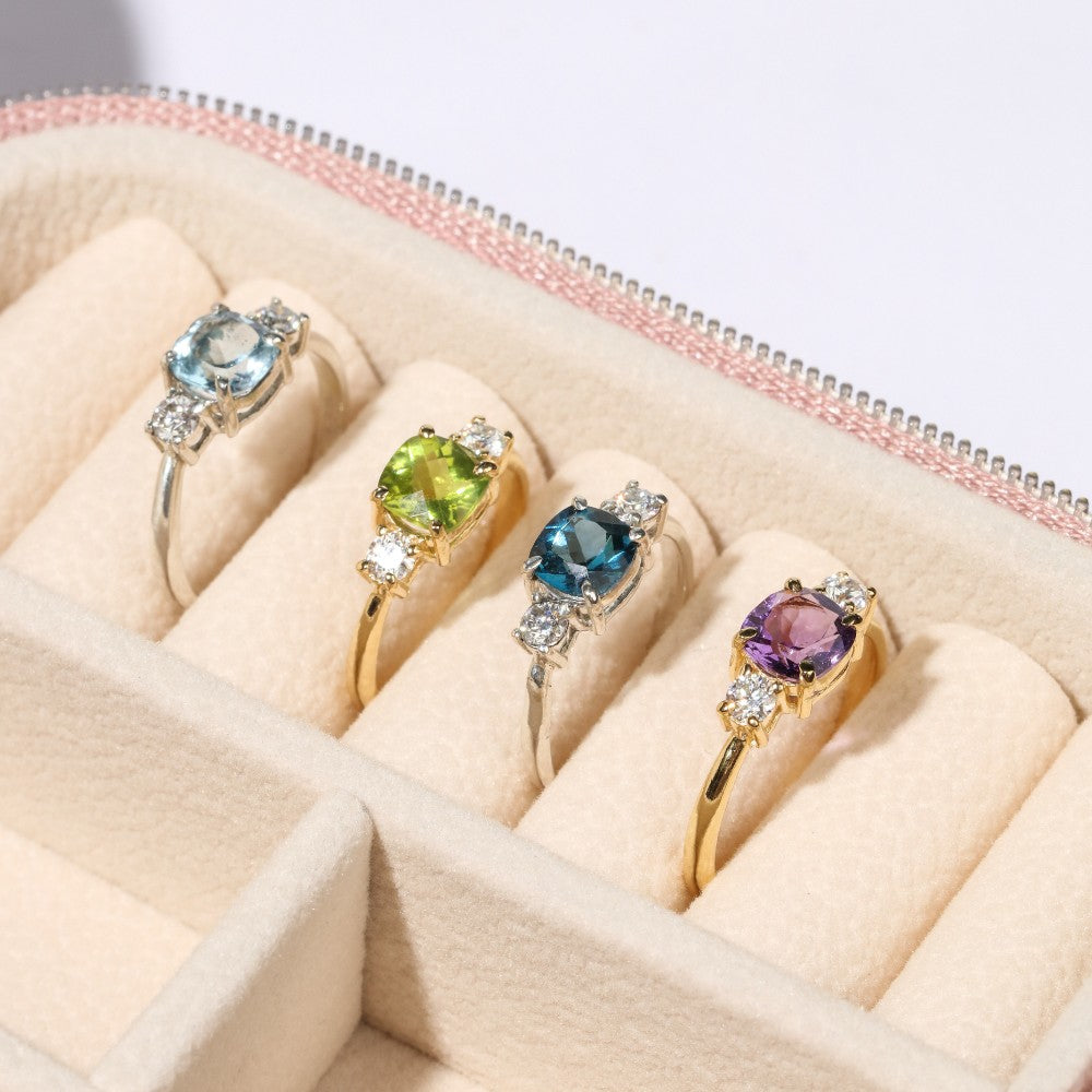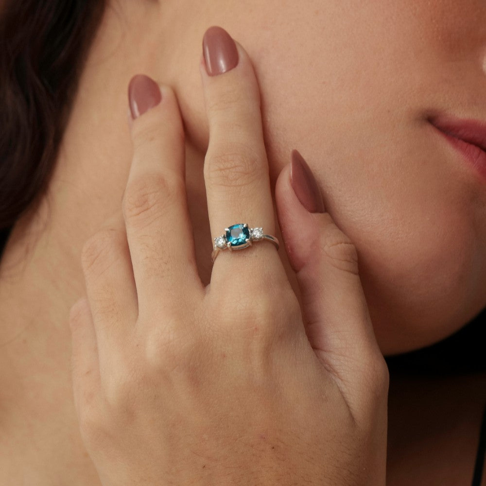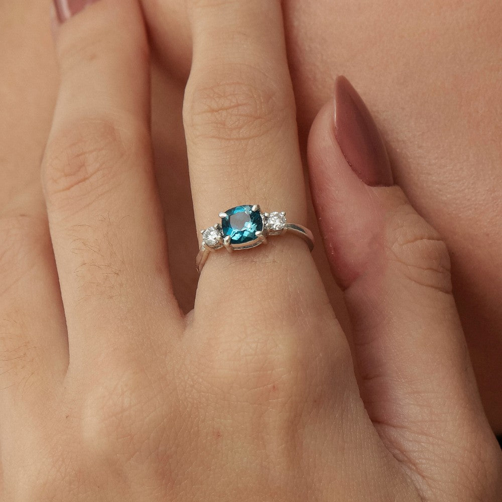 Com uma Pedra Natural em formato cushion de 6x6mm e duas pedras redondas Moissanita de cada lado de 3mm, nosso anel Victoria leva o nome de rainha por remeter muito as joias da realeza.