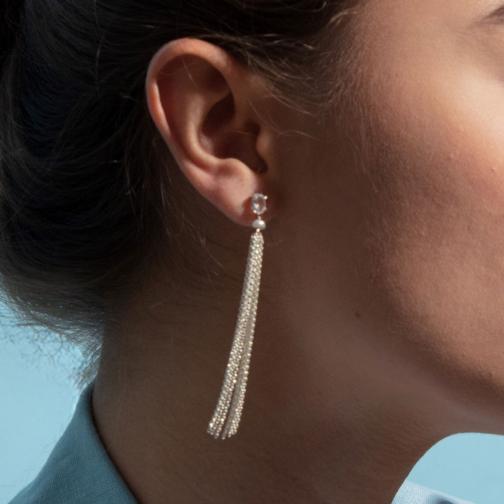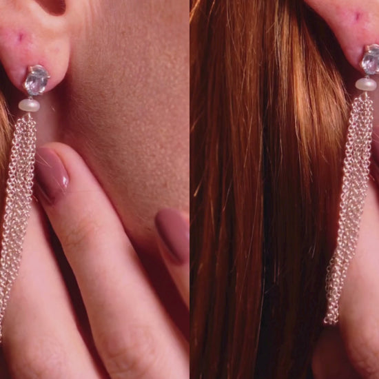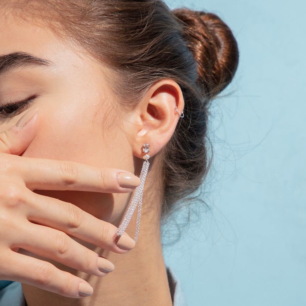 Brincos de pedra natural oval tamanho 4x6mm, com chuveirinho de correntes de 6cm preso através de uma pérolinha natural.