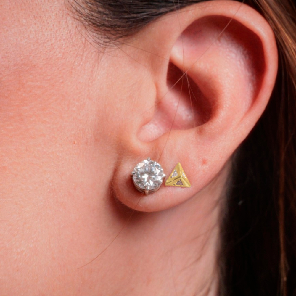 Brincos em formato de pirâmide com pedras cravejadas em cada face, disponível em Moissanite ou Esmeralda.