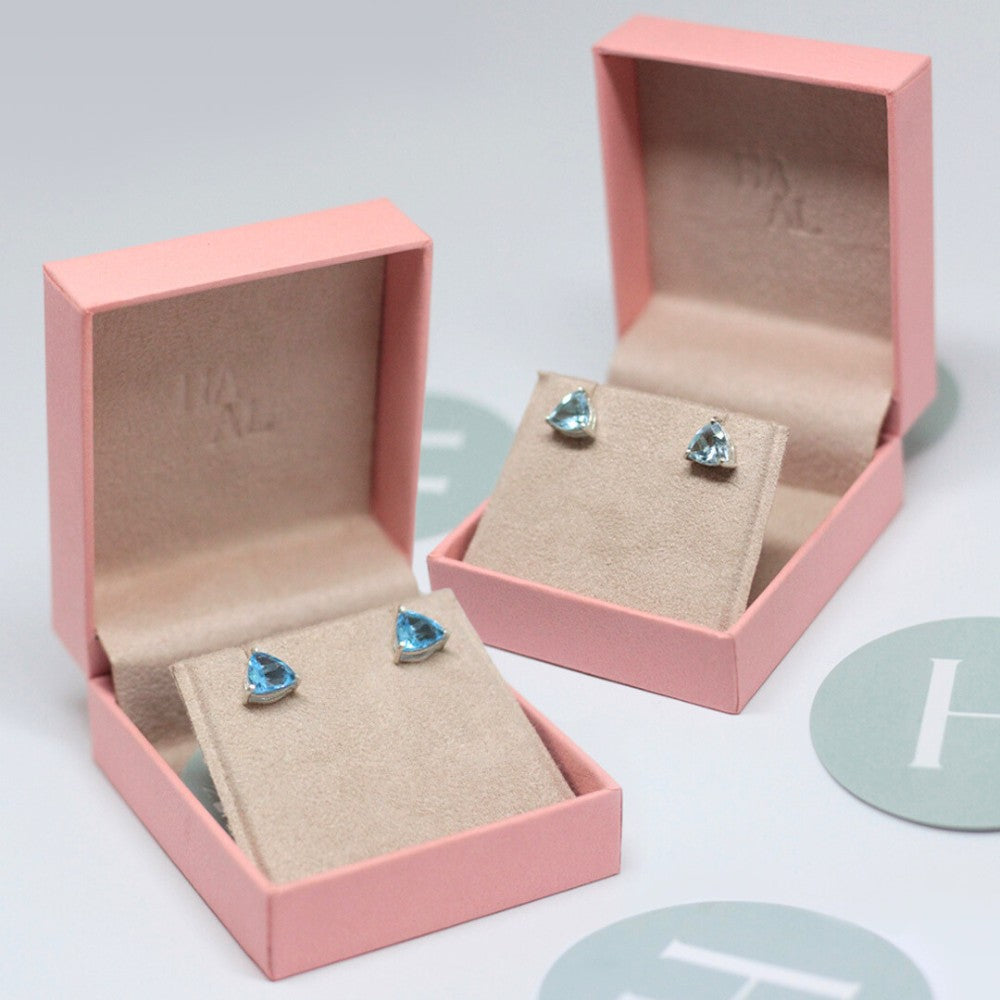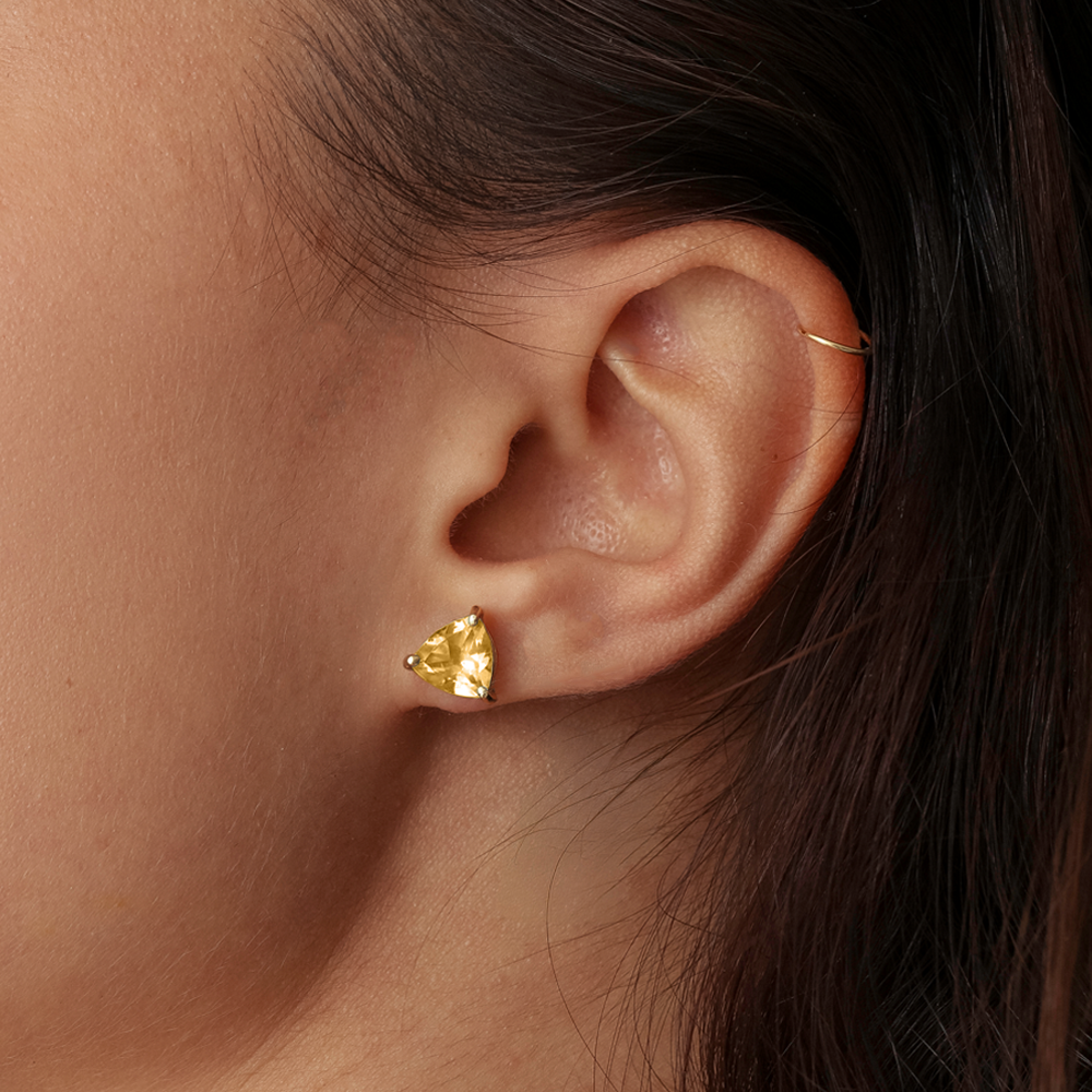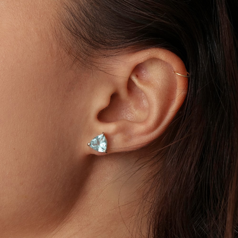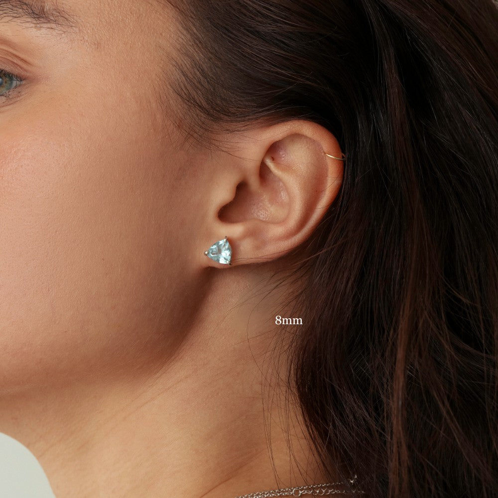 Brincos solitários em galeria formato trillion, nos tamanhos 4x4mm, 6x6mm, 8x8mm e 10x10mm.