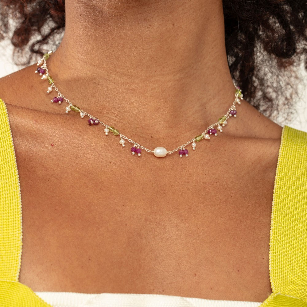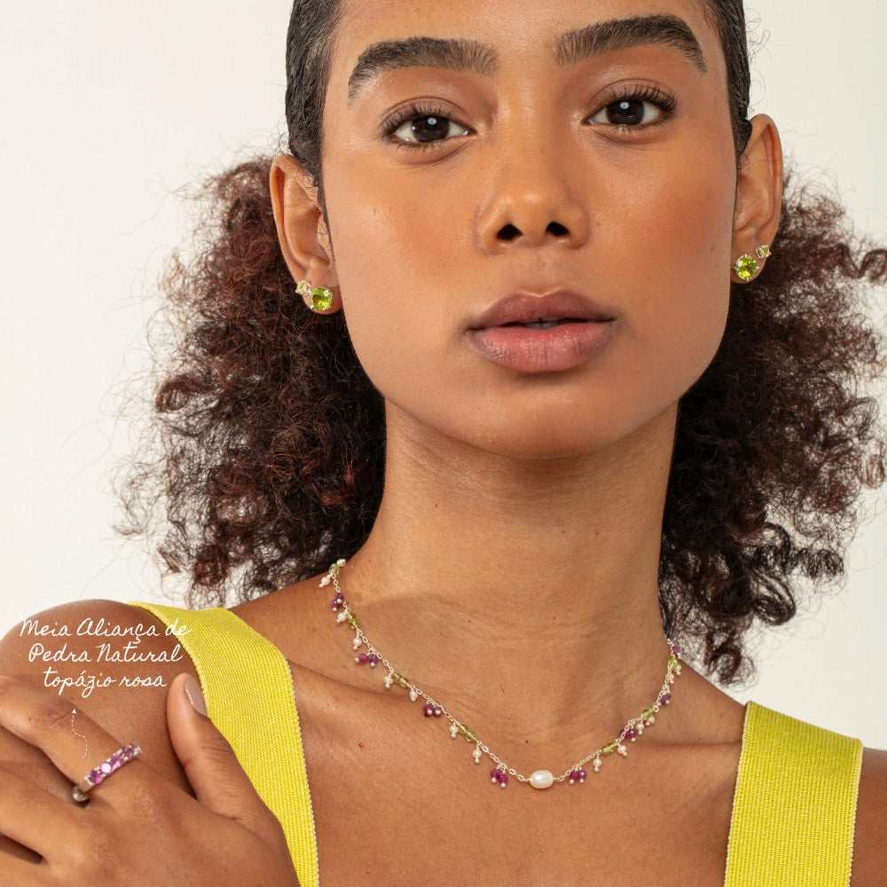 Pedras naturais de 3mm Peridoto, Rubi e Perolinhas. Perola oval no centro tamanho 7mm.