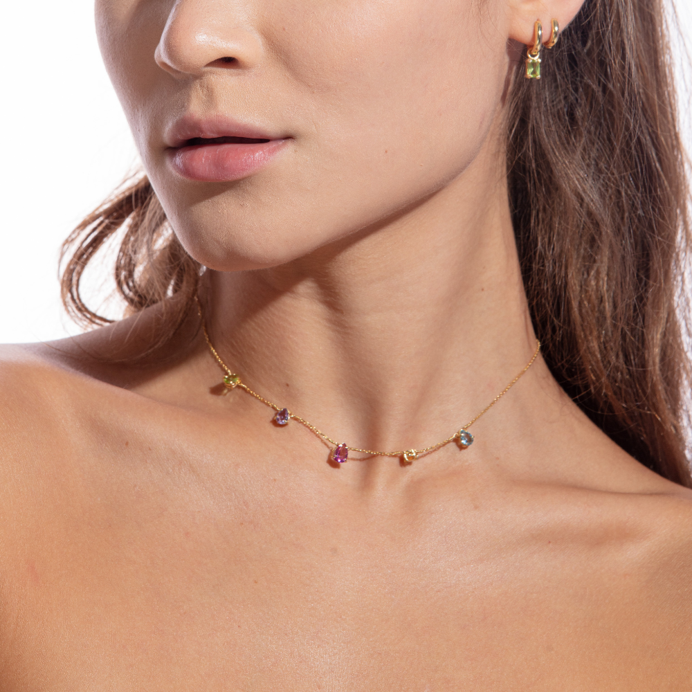 Opção com 5 pedras: Peridoto, Ametista, Topázio Rosa, Citrino e Topázio Azul Sky.