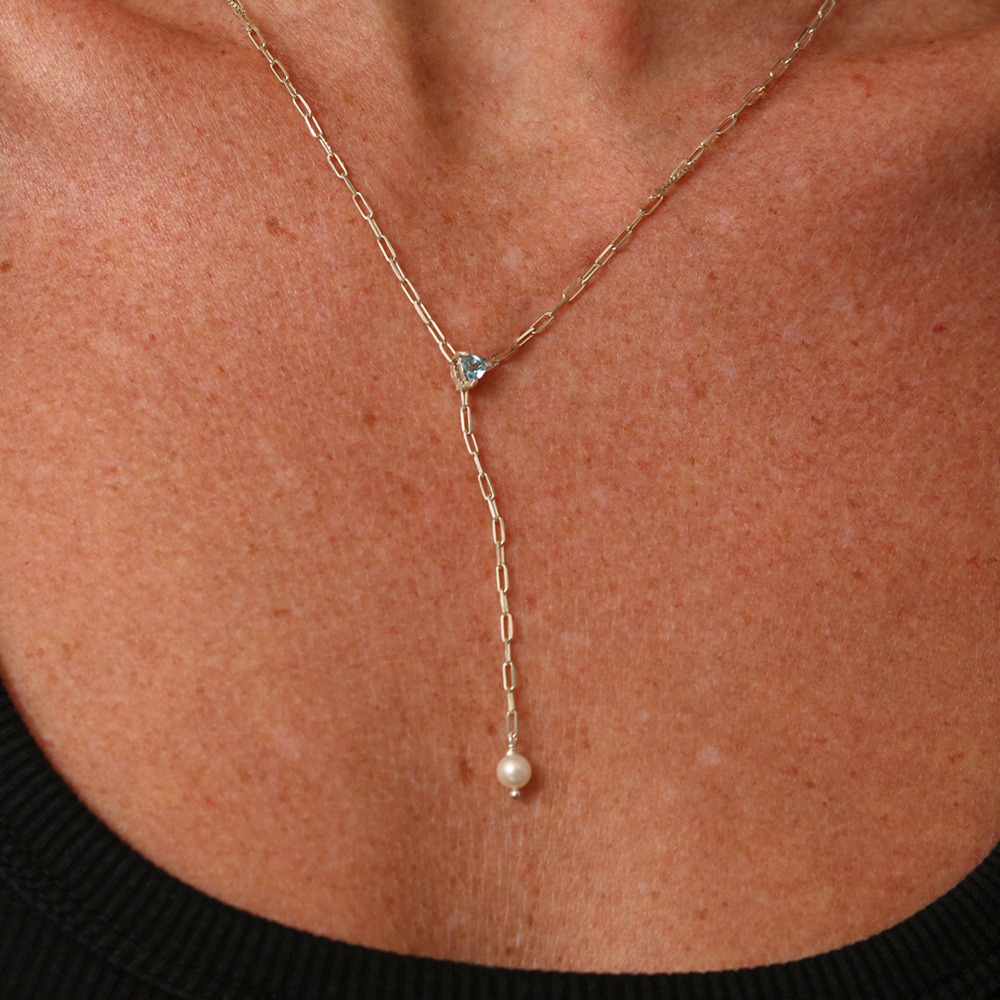 Gravatinhas são super elegantes, vão com tudo... e essa é ainda mais especial pois leva um Topázio Azul Swiss Natural nela e uma pérola natural de água doce.