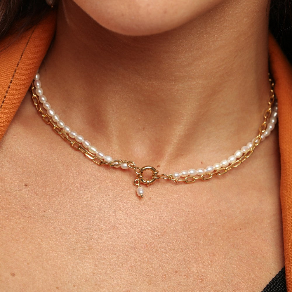 Joia cheia de personalidade e super descolada. Tamanho 40cm. Pérola modelo grão de arroz tamanho 3x5mm e corrente elo Cartier espessura 4mm, fecho boia tamanho 10mm com uma perolinha dando aquele acabamento perfeito. Para usar tanto com o fecho na frente quanto atrás. 2 colares em 1.
