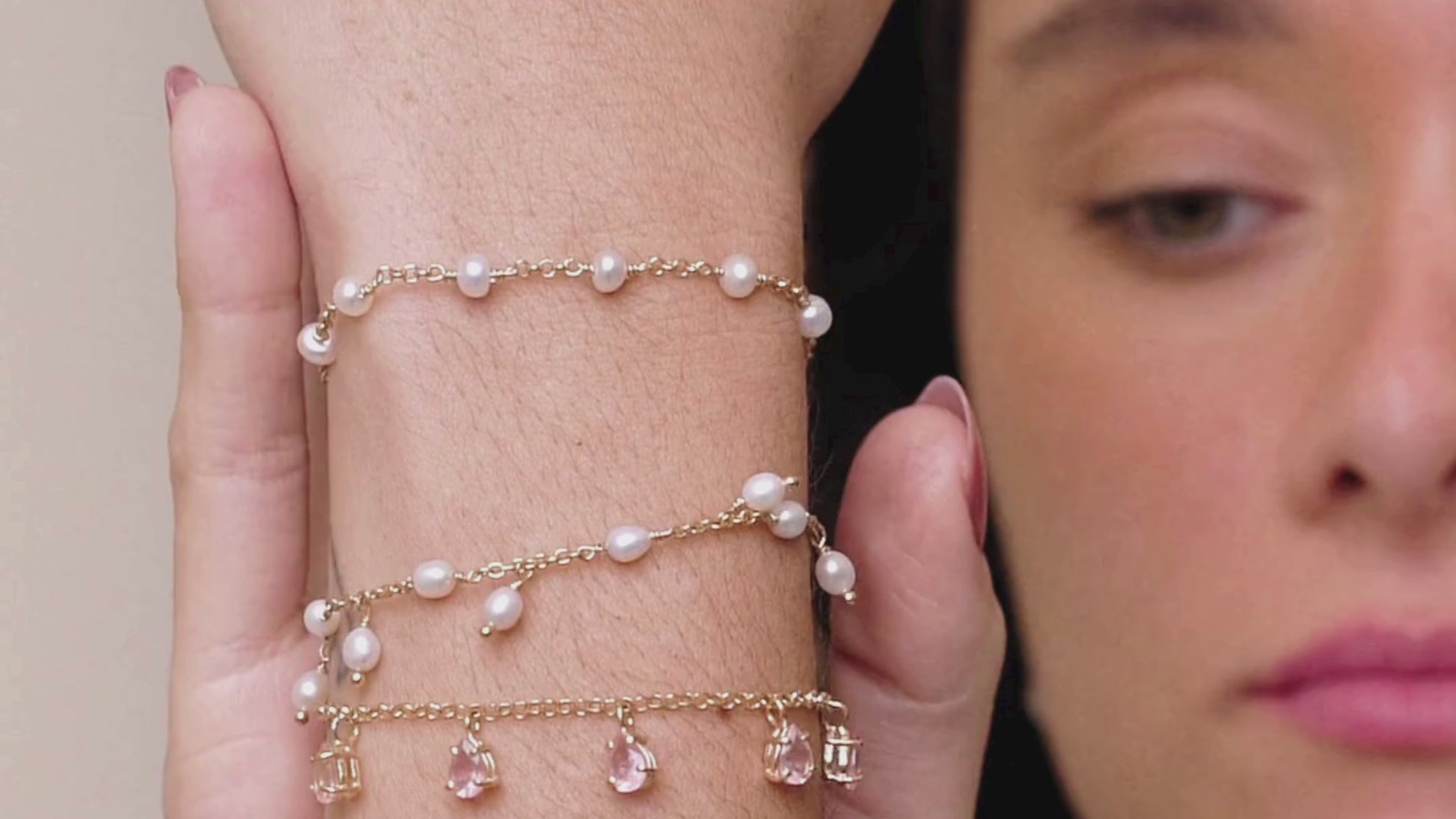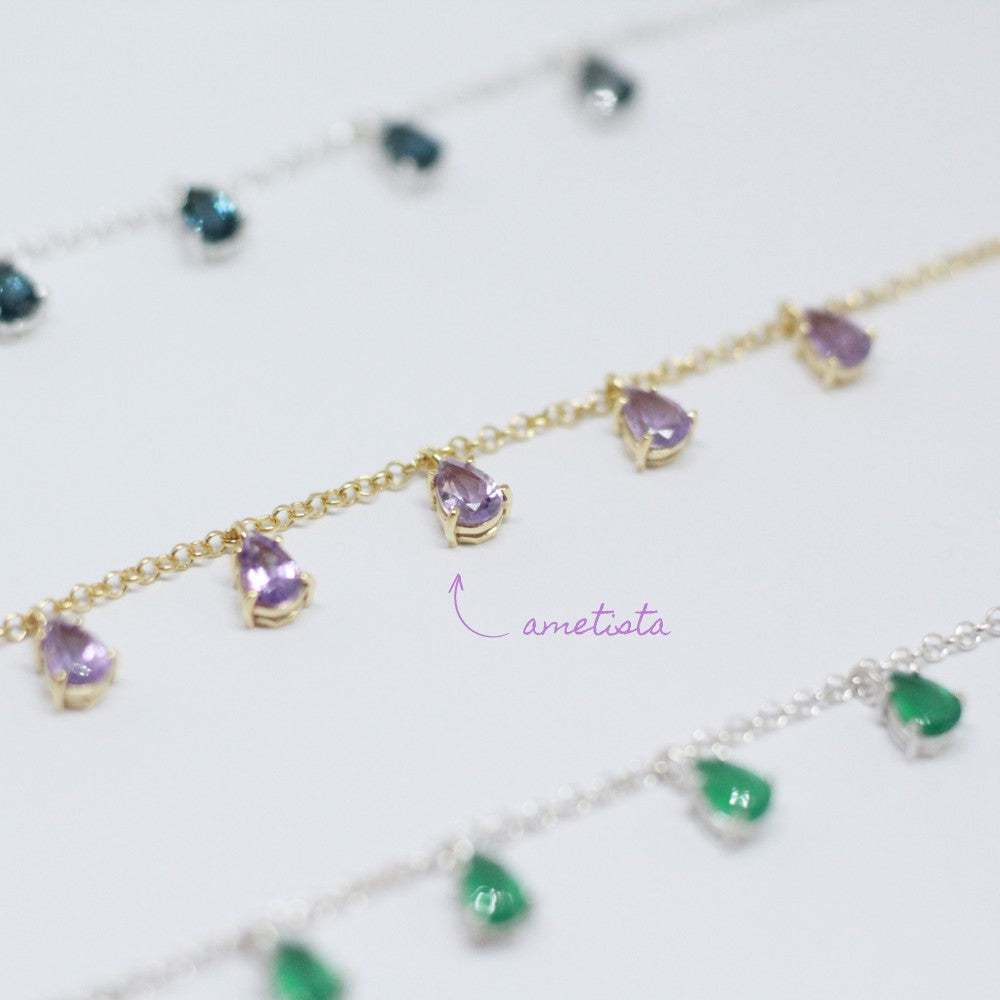 Nossa pulseira Claire leva 5 pingentes de gotinha tamanho 4x6mm na corrente elo português, igual ao colar. Comprimento da corrente é de 15cm + 3cm de extensor.