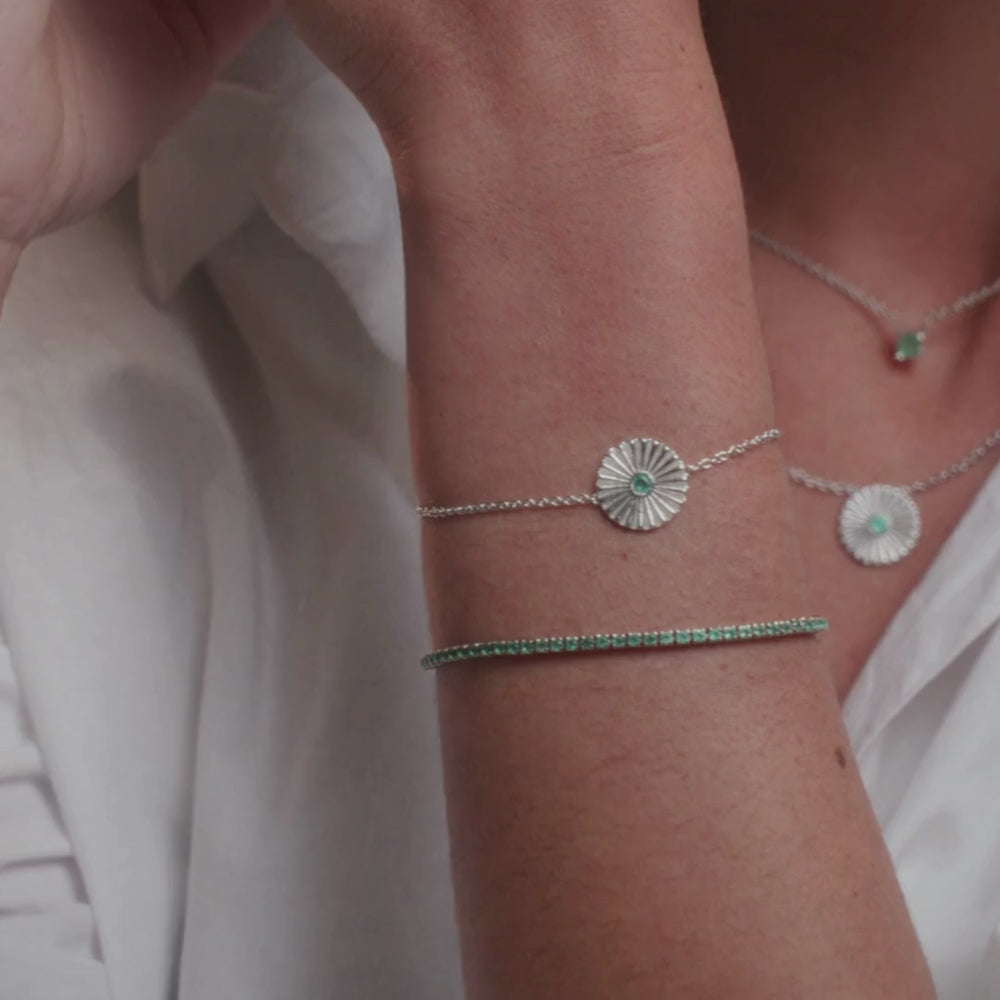 Pulseira com pingente redondo de 15mm em prata 925 com pedra central em Moissanite ou Esmeralda, combinando sofisticação e brilho.